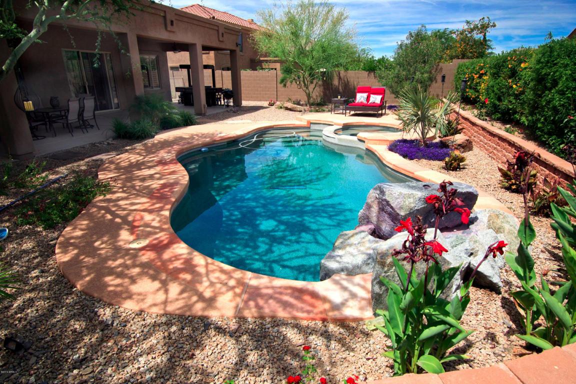 his home boasts an alluring open floorplan, inviting you to experience the epitome of comfort and style. Your kitchen is adorned with gleaming appliances, granite countertops, and an abundance of cabinetry, flowing into the great room. This expansive living area exudes grandeur with its elegant tiled floors, cozy fireplace, dedicated dining space, and an abundance of natural light that floods the room. Other highlights of this home include high ceilings, plantation shutters, upgraded flooring, and much more. Step outside to the meticulously landscaped backyard, a serene oasis complete with a sparkling pool and a sprawling patio. Nestled within the desirable McDowell Mountain Ranch community with community pool, playground, basketball courts, and more. Conveniently located near Loop 101.