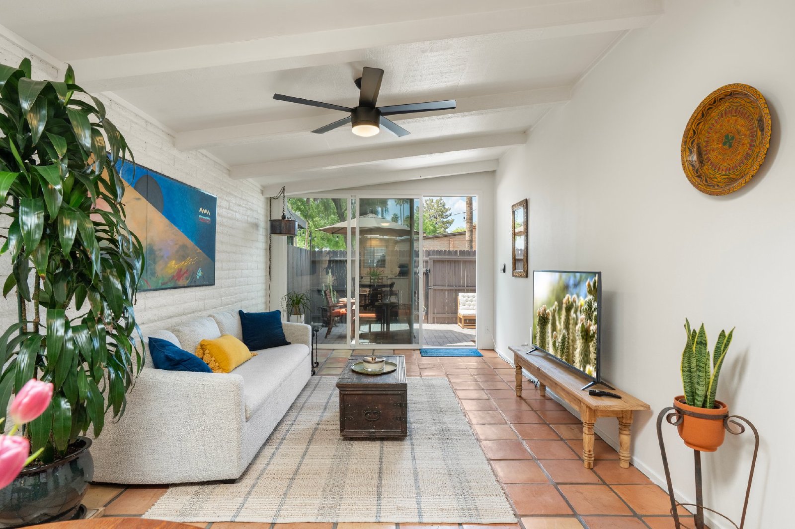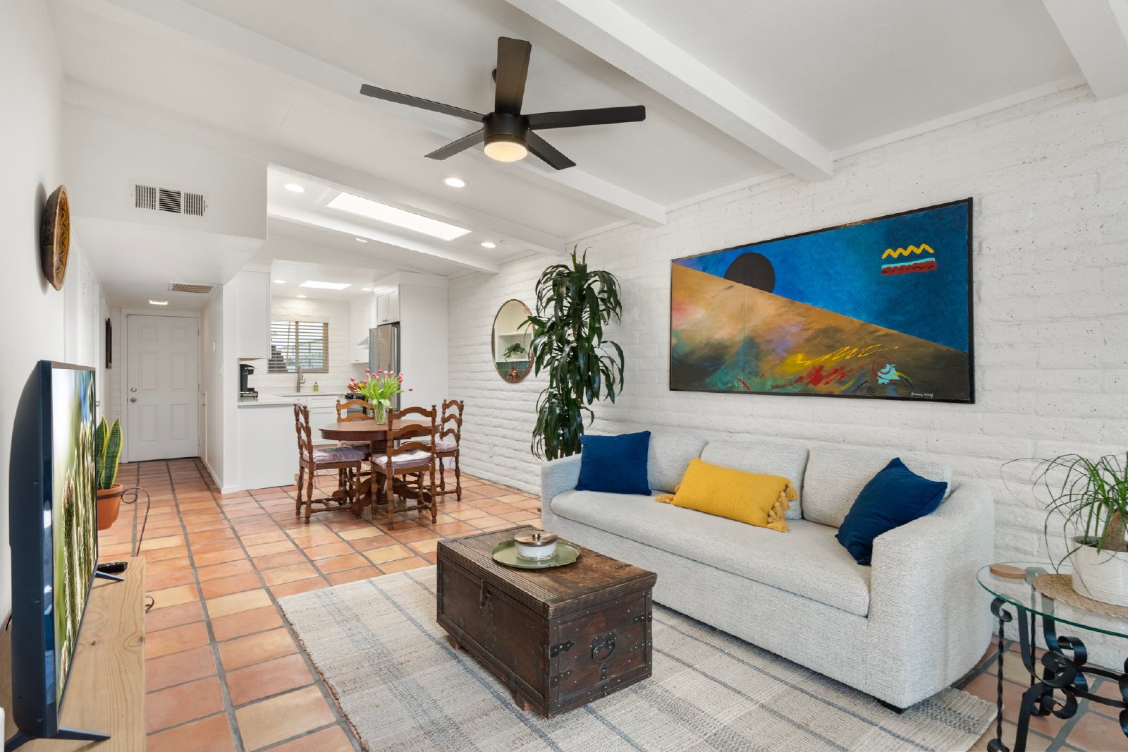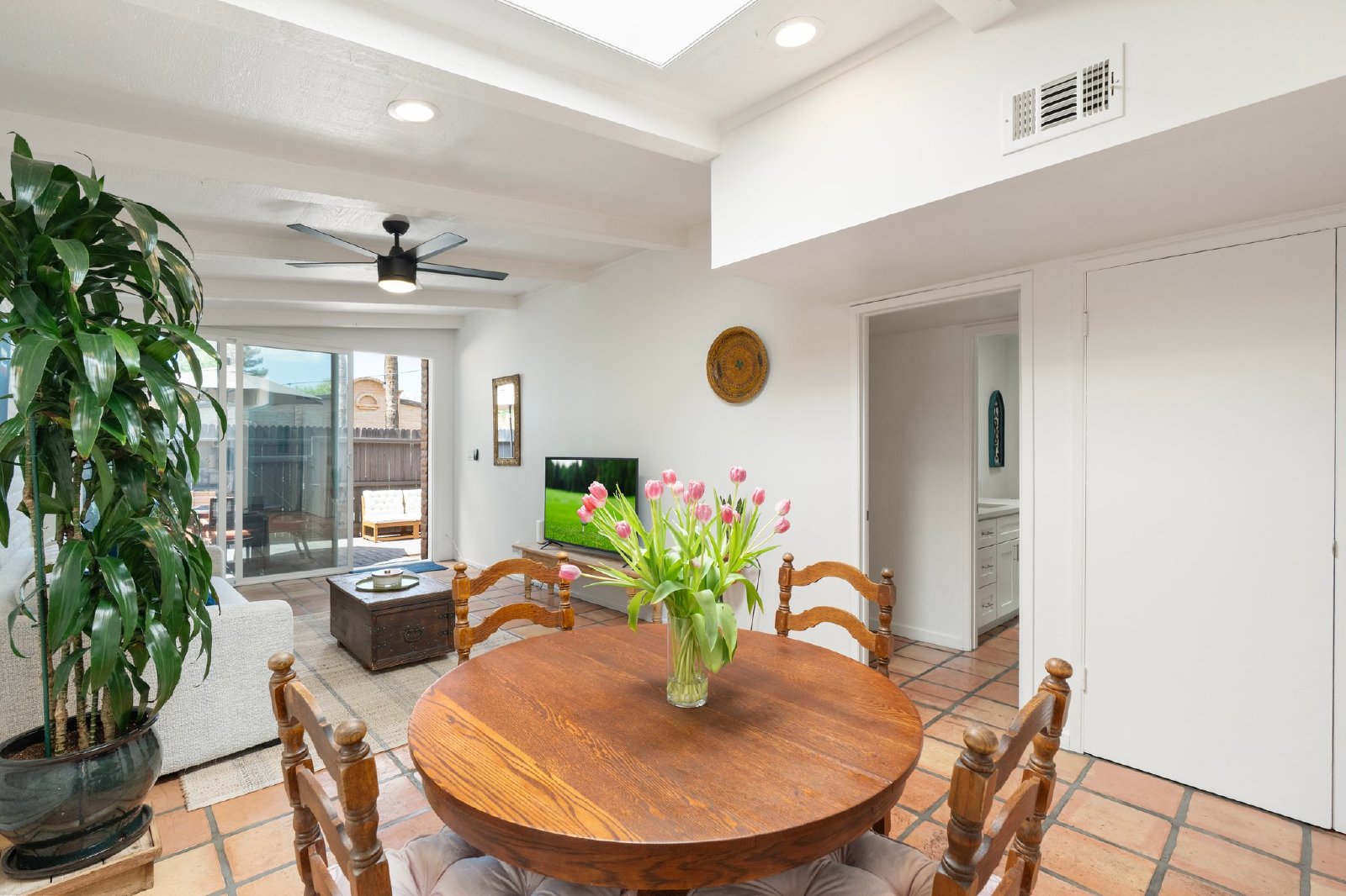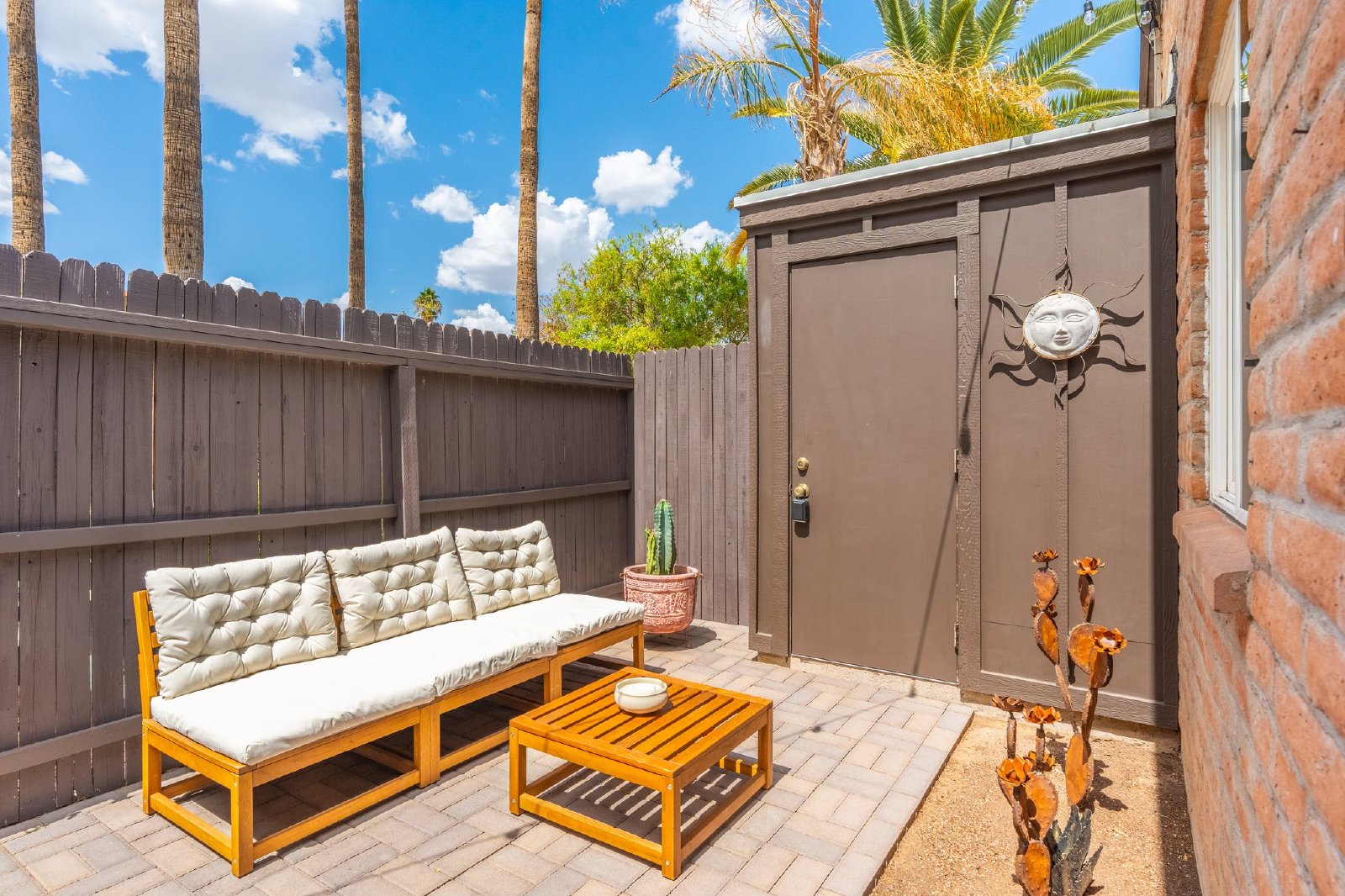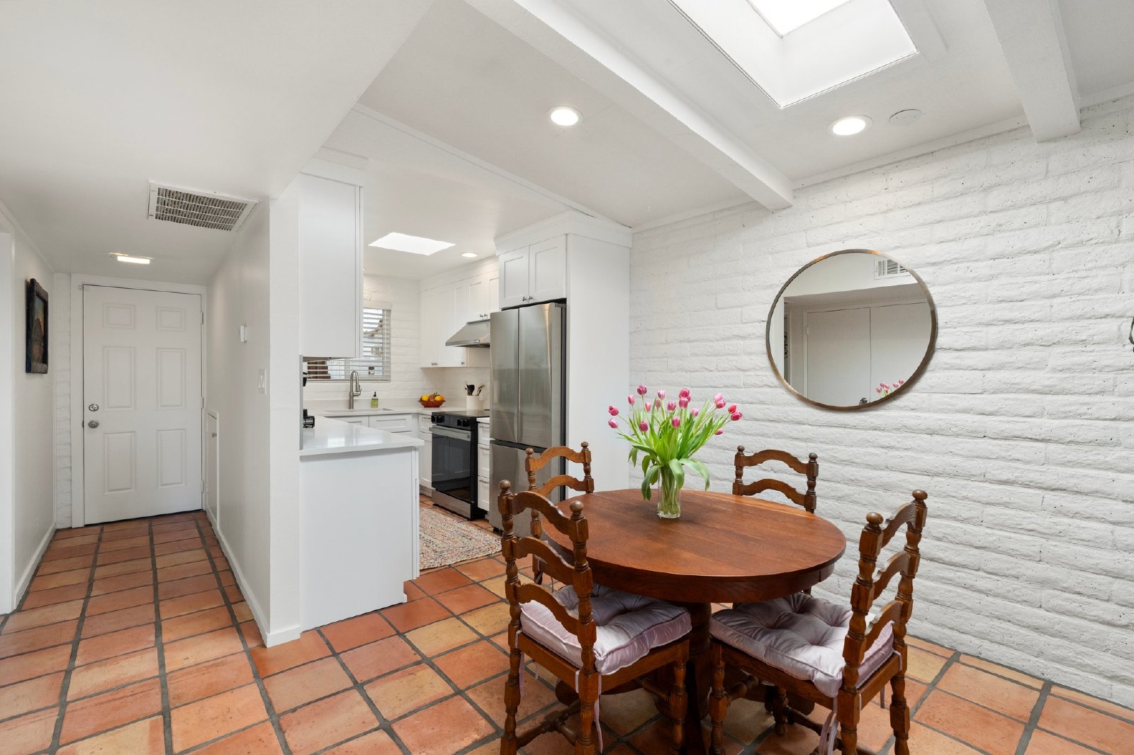 Charming Spanish-Style Townhouse Near Biltmore and Arcadia. This beautifully maintained townhouse blends Spanish influence with classic details. Nestled just minutes from Biltmore and Arcadia districts, this home welcomes you with abundant natural light, timeless Saltillo tile flooring, exposed brick walls, and rustic wooden beams in the open-concept living and dining area. The kitchen features quartz countertops, stainless steel sink, and comes fully equipped with all appliances. The spacious primary suite offers generous storage. Energy-efficient upgrades include roof and skylights and dual-panel windows. Step outside to your private patio perfect for relaxing or entertaining.