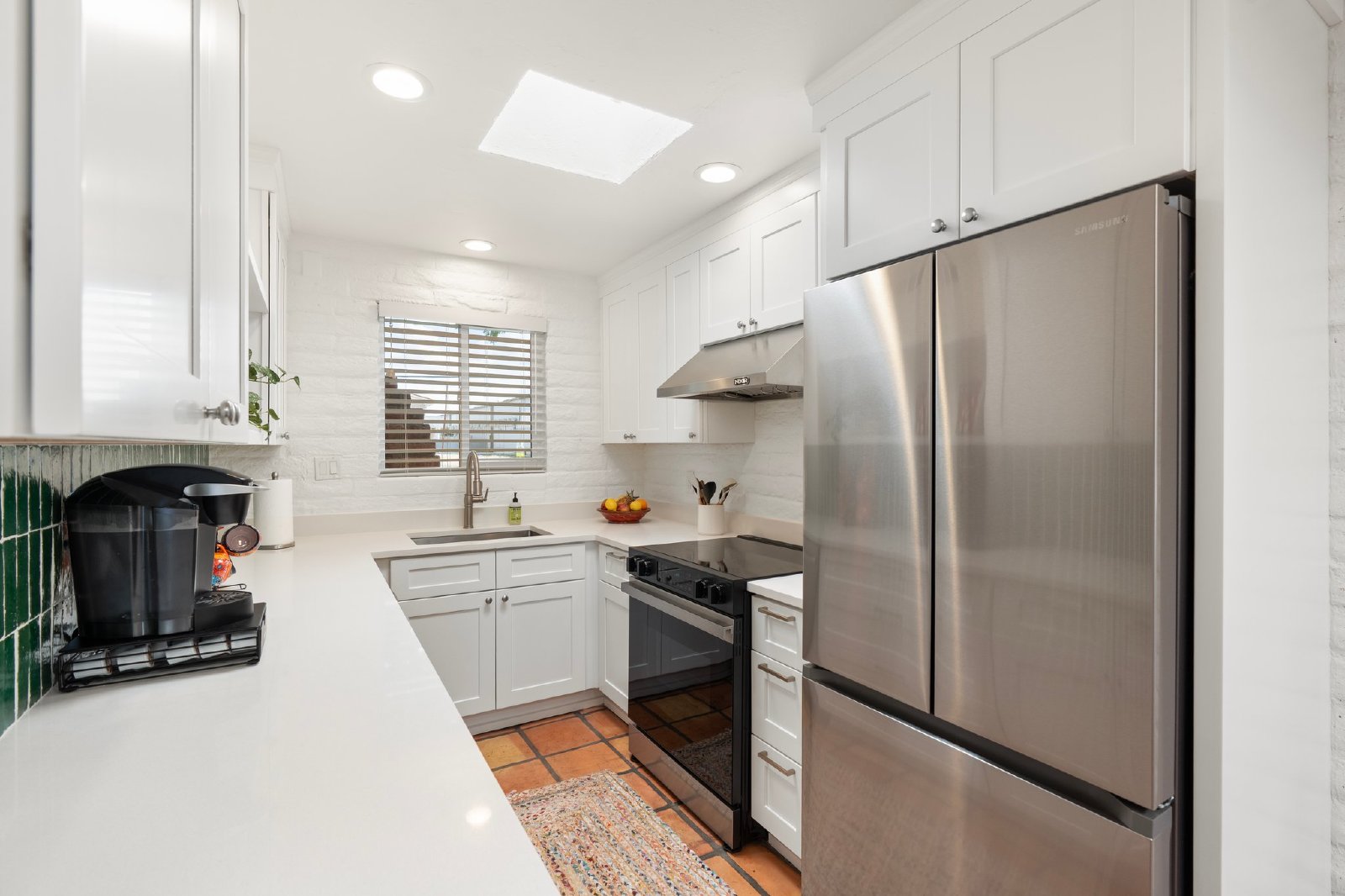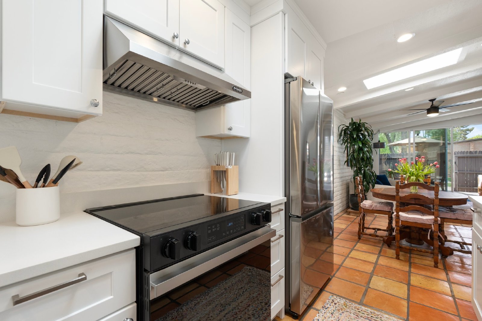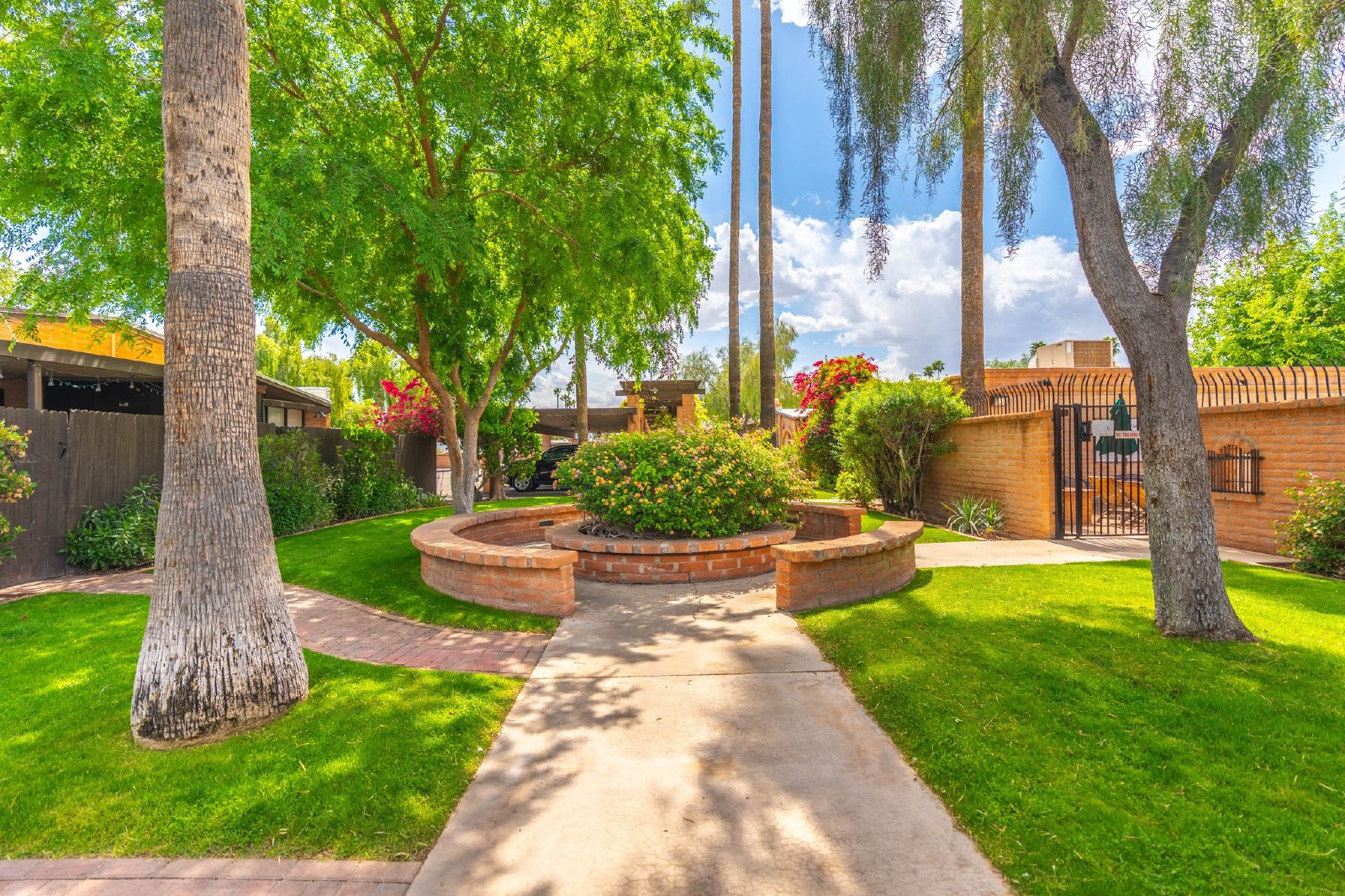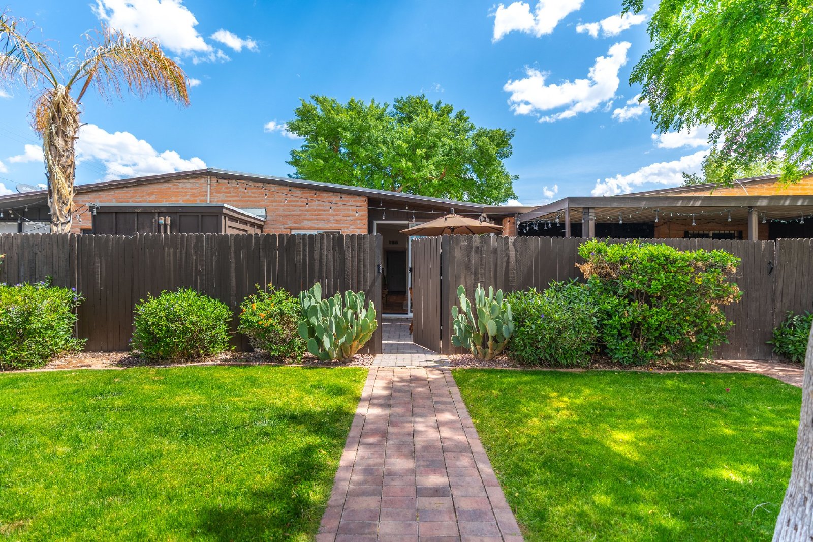 Charming Spanish-Style Townhouse Near Biltmore and Arcadia. This beautifully maintained townhouse blends Spanish influence with classic details. Nestled just minutes from Biltmore and Arcadia districts, this home welcomes you with abundant natural light, timeless Saltillo tile flooring, exposed brick walls, and rustic wooden beams in the open-concept living and dining area. The kitchen features quartz countertops, stainless steel sink, and comes fully equipped with all appliances. The spacious primary suite offers generous storage. Energy-efficient upgrades include roof and skylights and dual-panel windows. Step outside to your private patio perfect for relaxing or entertaining.